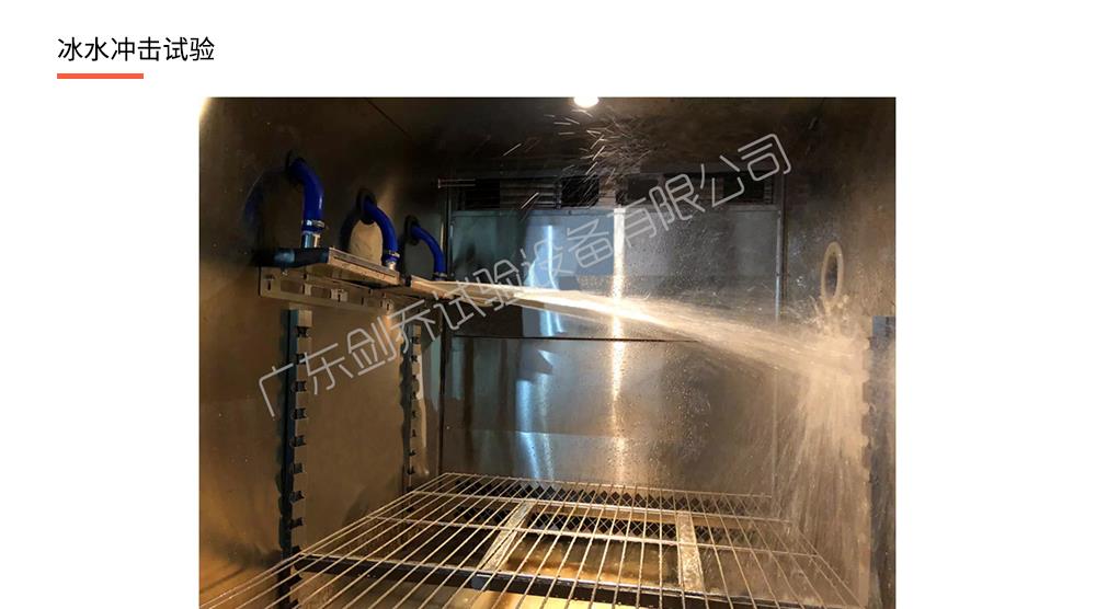 用途:冰水沖擊試驗(浪涌水的溫度沖擊試驗)是模擬部件在駛過積水時而產生的浪涌水的負荷情況,保證部件由于水而急劇冷卻情況下的功能穩定性。如車輛在冬季有水路面駕駛時冰水濺落到熱的系統/組件上,失效模式為不同的溫度膨脹系數導致的材料機械破裂或密封失效