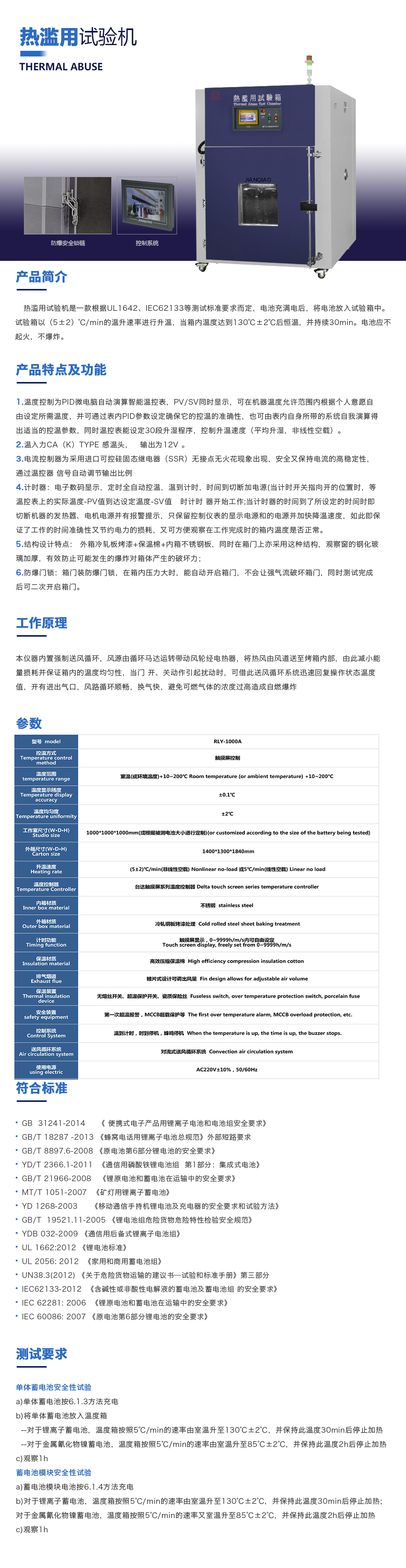 用途:熱濫用試驗(yàn)箱是一款根據(jù)UL1642、IEC62133等測(cè)試標(biāo)準(zhǔn)要求而定,電池充滿電后,將電池放入試驗(yàn)箱中。試驗(yàn)箱以(5±2)℃/min的溫升速率進(jìn)行升溫,當(dāng)箱內(nèi)溫度達(dá)到130℃±2℃后恒溫,并持續(xù)