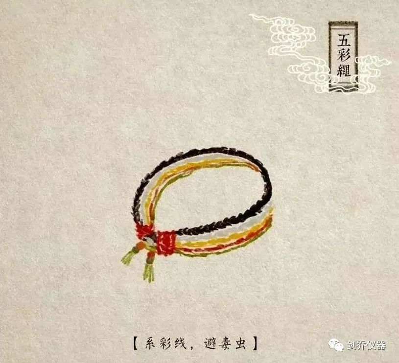 五彩繩,又稱五彩絲、五色絲等,是端午節(jié)吉祥物兼飾物,具有辟邪作用,兼有祈福納吉的美好寓意。五彩繩源于我國古代的五行觀念,由古代文身之俗演變而來。