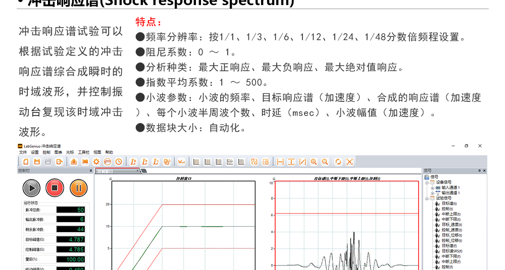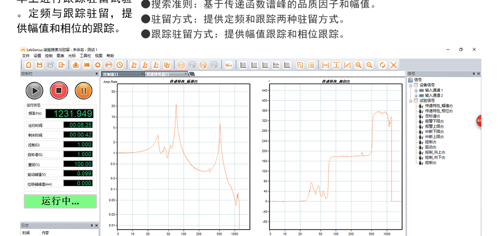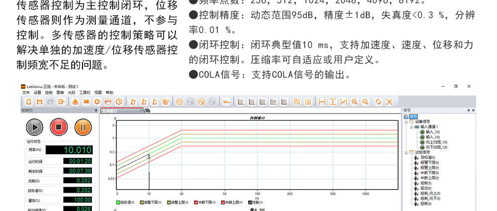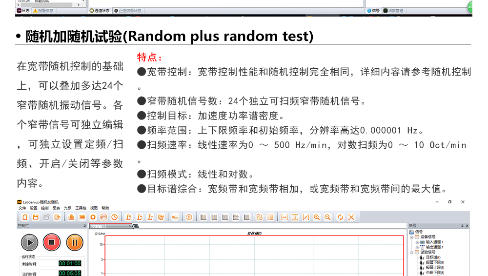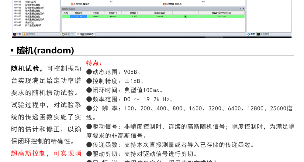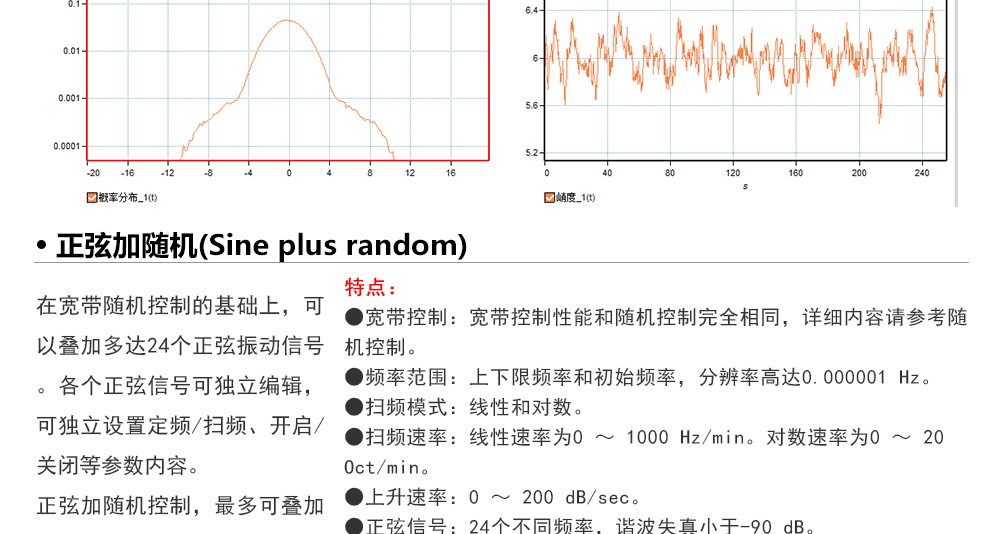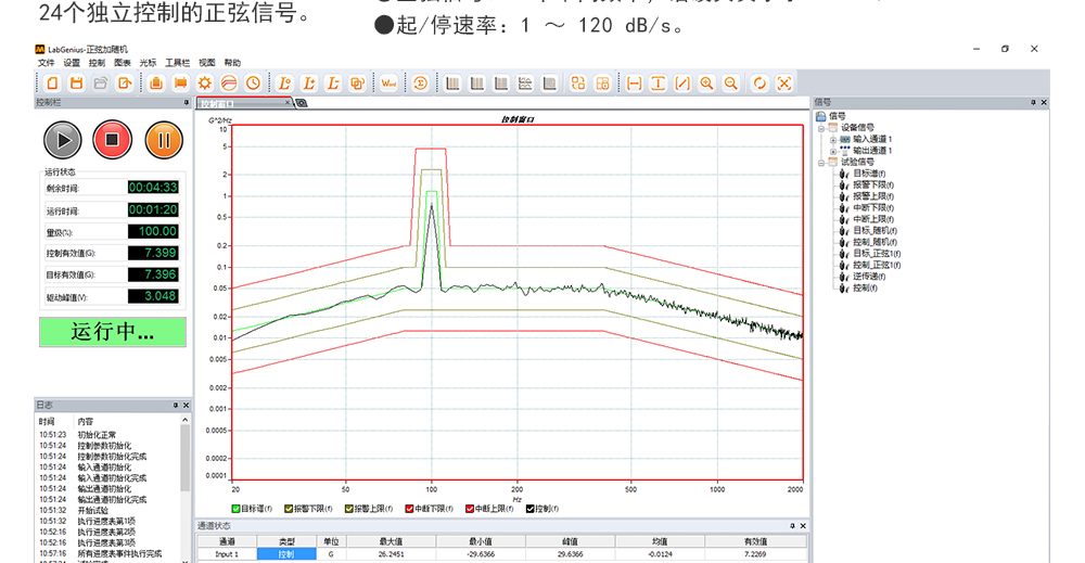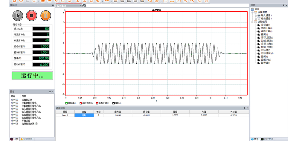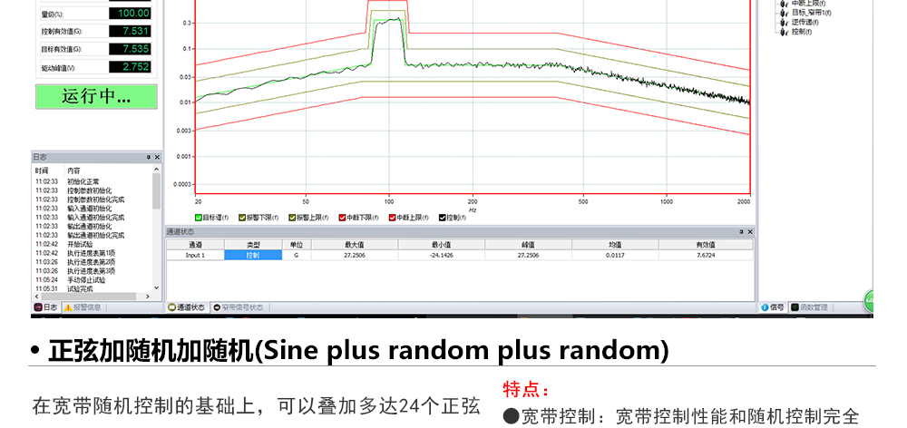 用途:正弦試驗(yàn)可以控制振動(dòng)臺(tái)實(shí)現(xiàn)定頻(駐留)、掃頻等振動(dòng)試驗(yàn)。控制算法中采用了跟蹤濾波的幅值以及相位檢測(cè)算法,可以實(shí)現(xiàn)對(duì)控制信號(hào)的準(zhǔn)確反饋以及實(shí)時(shí)的閉環(huán)控制。