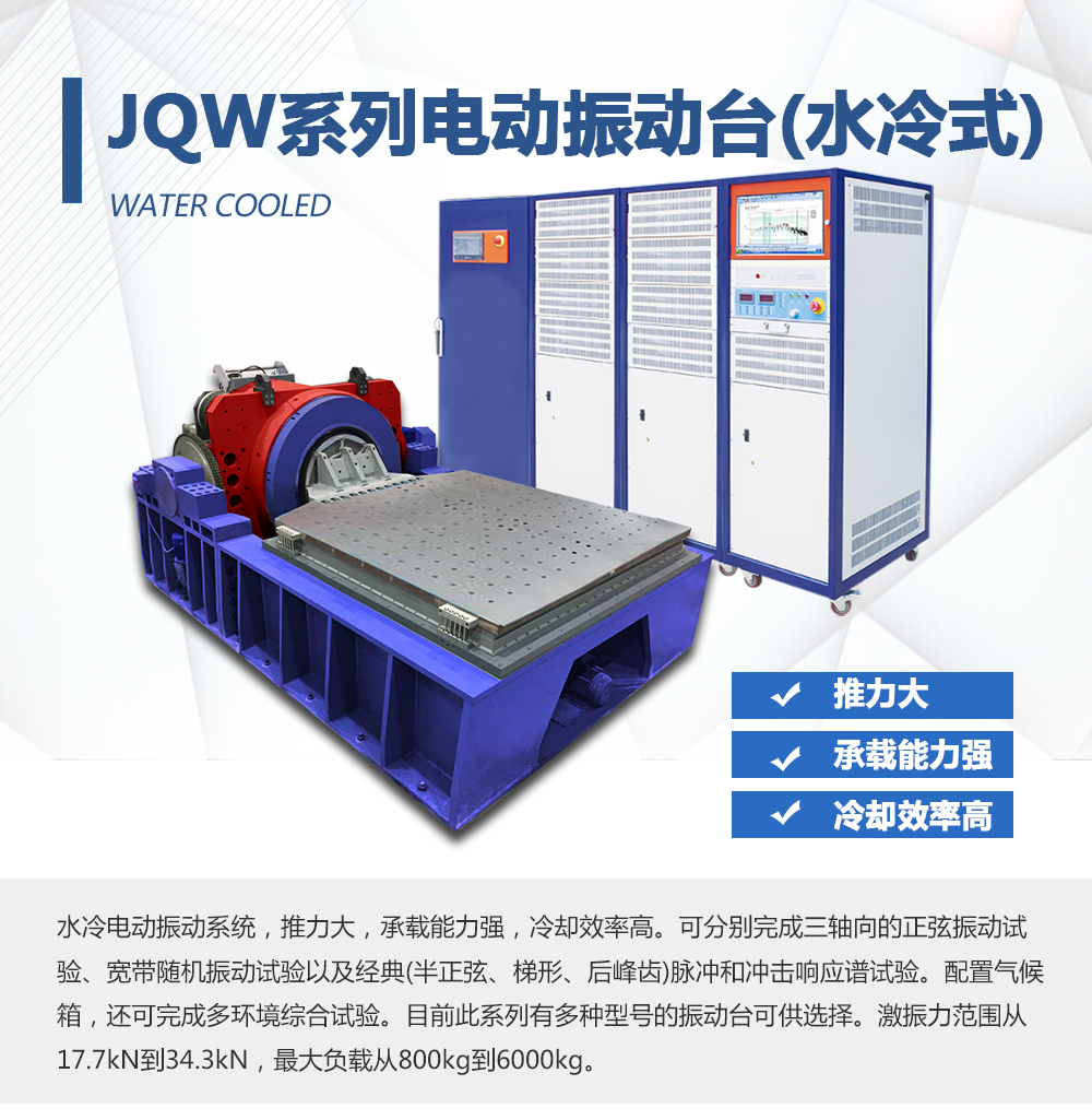 用途:水冷臺電動試驗系統,推力大,承載能力強,冷卻效率高。可分別完成三軸向的正弦振動試驗、寬帶隨機振動試驗以及經典(半正弦、梯形、后峰齒)脈沖和沖擊響應譜試驗。